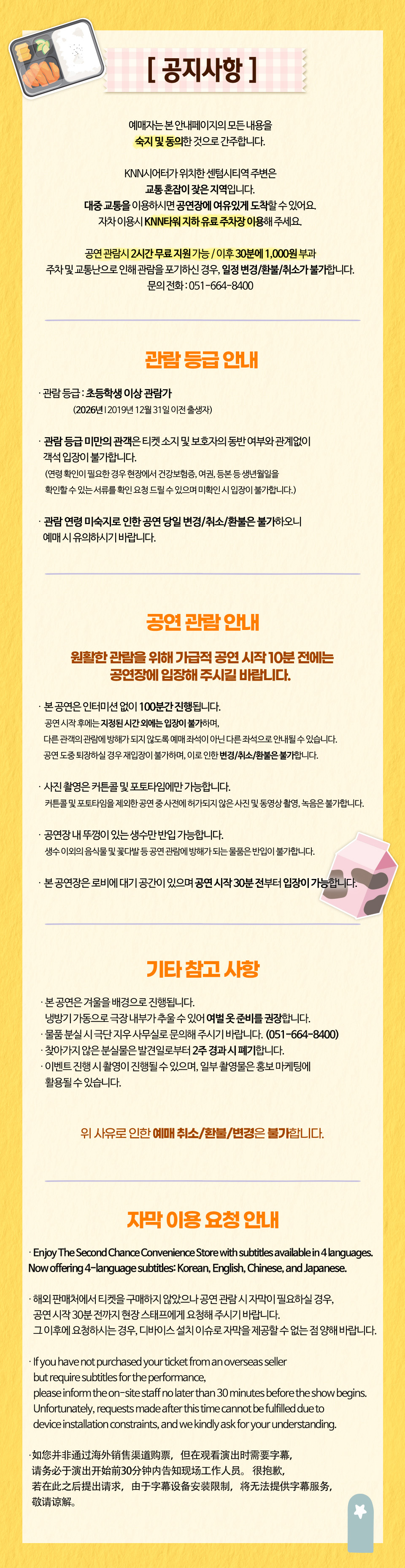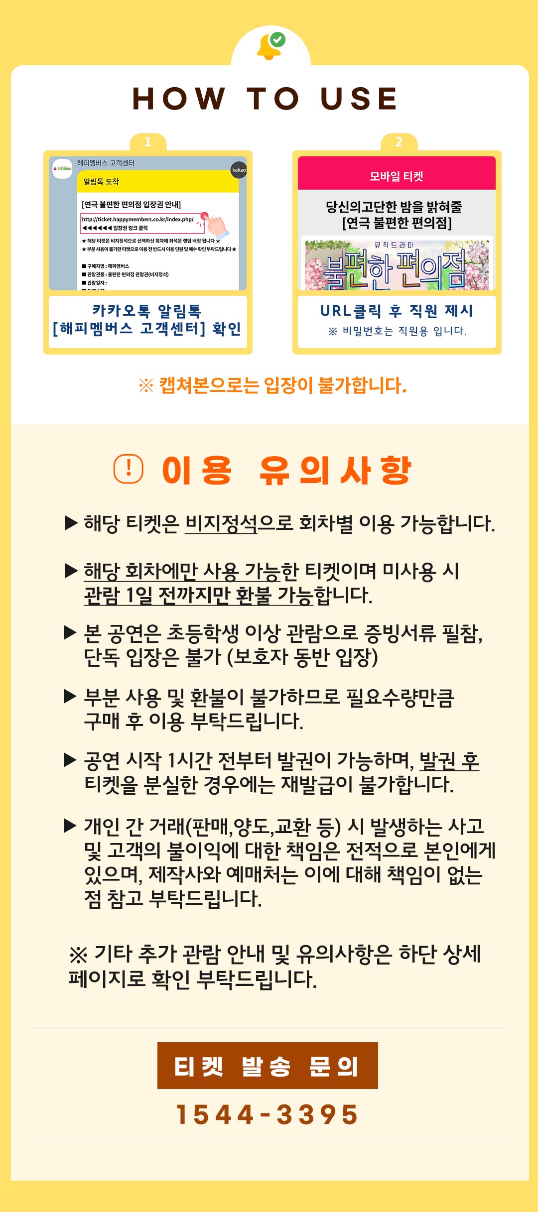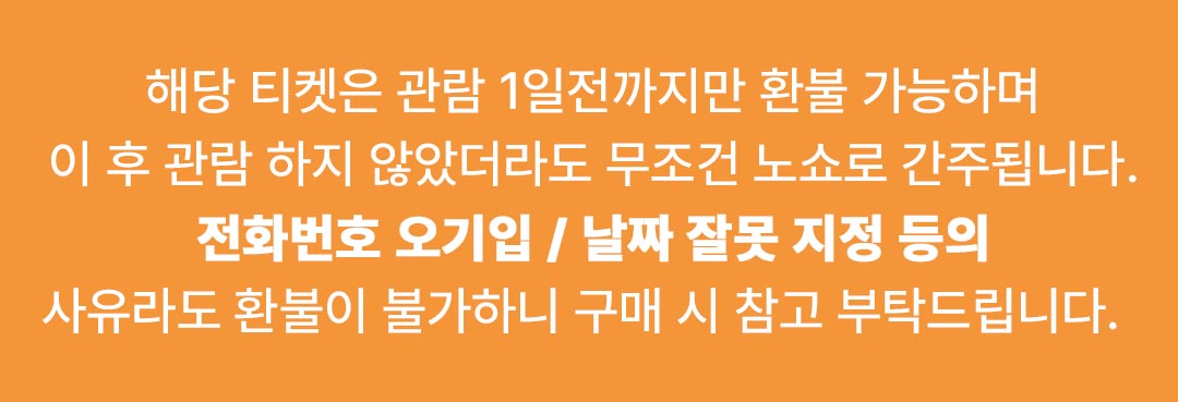 - 관람일 잘못 지정, 전화번호 오기입 등의 사유라도 관람 1일전까지만 환불 가능하오니 반드시 구매 시 유의바랍니다.