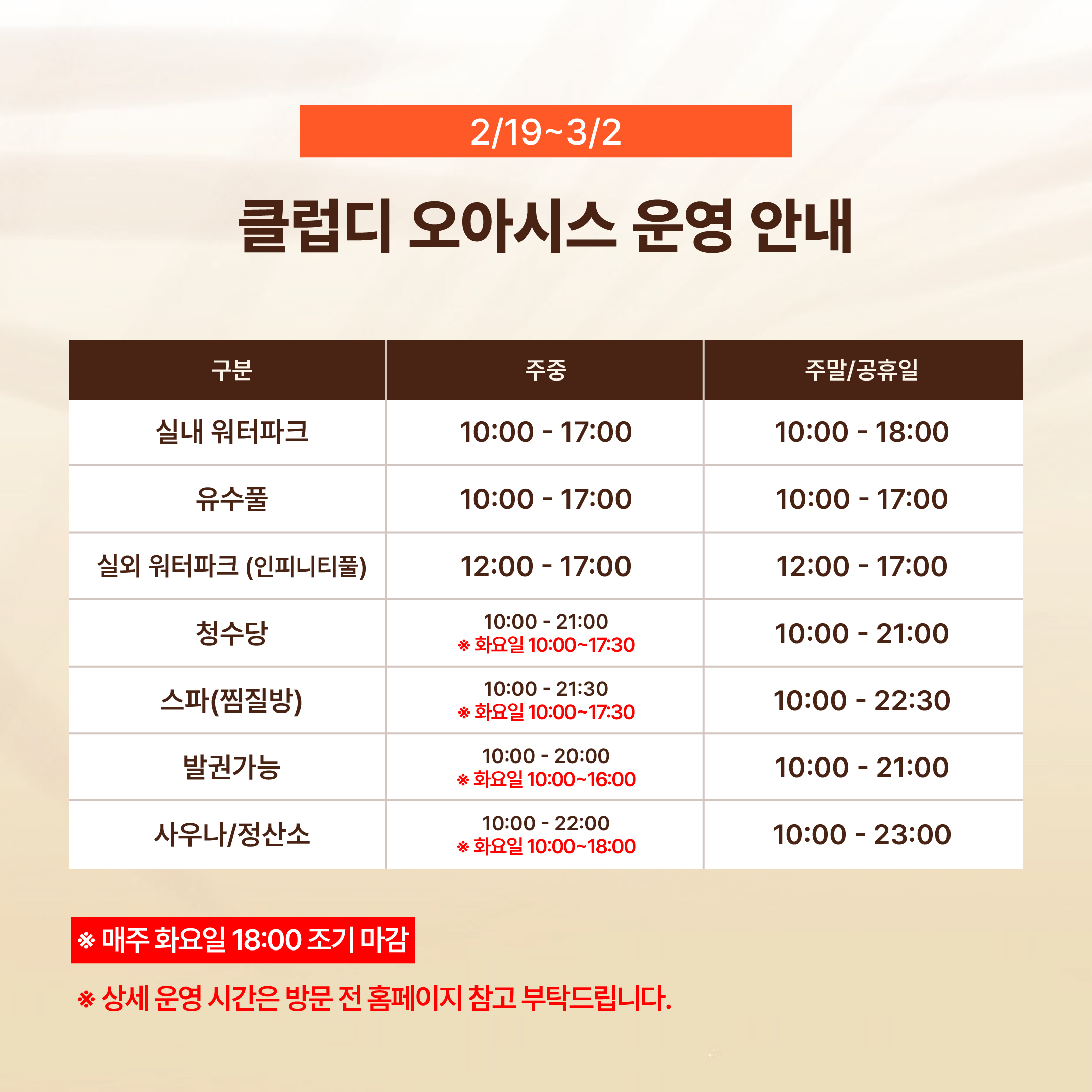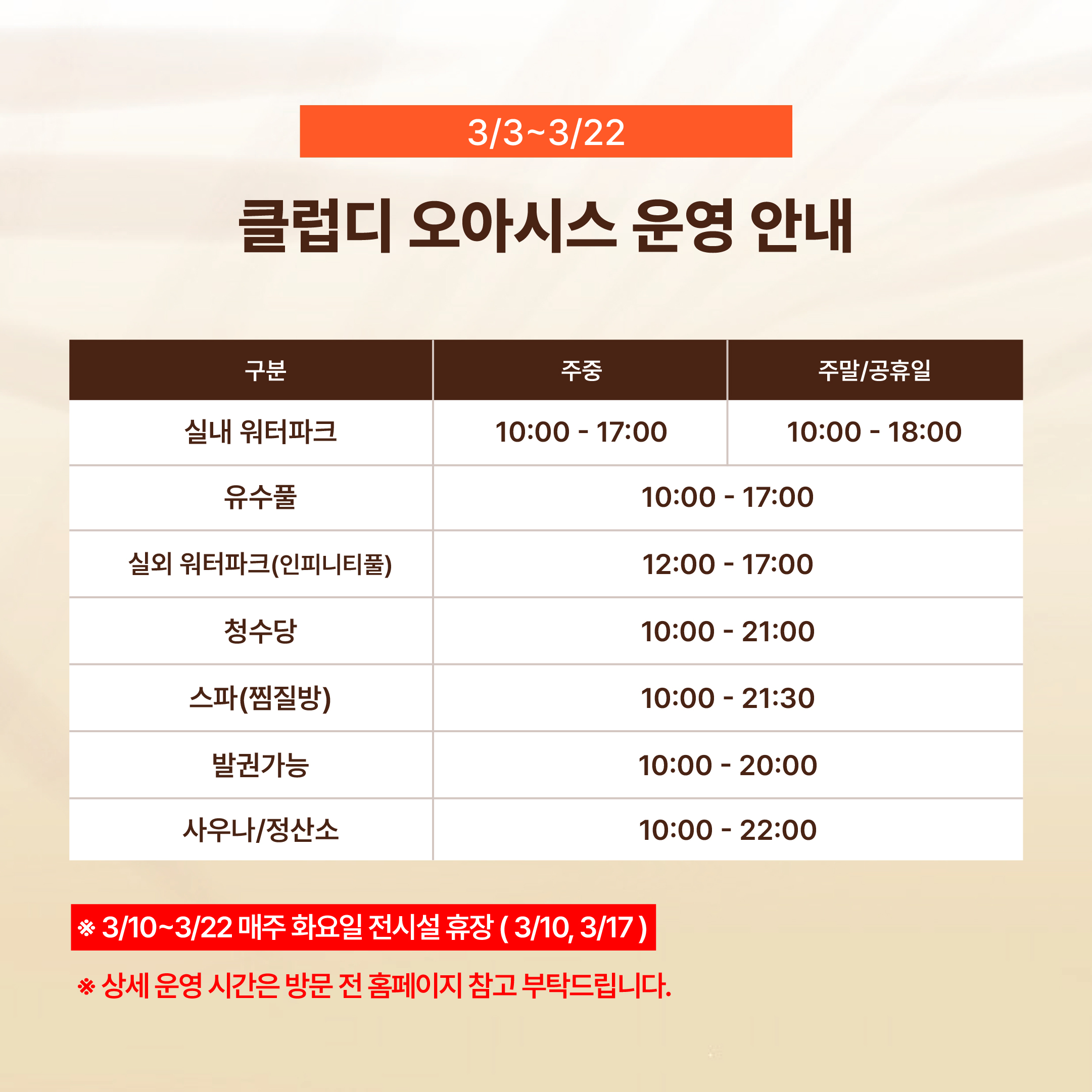 매주 화요일 및 4월 1일 전체휴장, 3월 23일~4월7일 워터파크 휴장